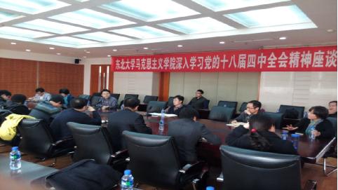 与会人员在发言中就党的十八届四中全会精神进行了分析和解读,深入交流了对全会精神的认识和体会。与会人员指出,全会提出要将法治创新和创新人才培养相结合,马克思主义法治思想和社会主义法治理论不仅要进入课堂,而且要形成有特色的法律理论体系、学科体系和课程体系。高校要把依法治国融入到思想政治课堂和日常的思想教育中,以良法的构建为前提,不断探索和完善符合教学实际需要的科学教育体系和内容,把法律的价值渗透到教育教学过程中,让学生用法治精神武装头脑,牢固树立起法治理念。