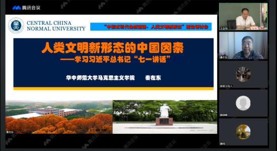 秦在东教授作了题为《人类文明新形态的中国因素——学习习近平总书记“七一讲话”》的主旨报告。他表示,中国共产党在领导中国人民创造中国式现代化新道路的同时,创造了人类文明新形态,充分彰显着具有世界意义的四种中国元素,即中国共产党始终主导“五个文明”的全过程建设,中国式制度体系是“五个文明”协调发展的有力保障,中华优秀传统文化、革命文化和社会主义先进文化高度融合为“五个文明”的协调发展提供了取之不尽、用之不竭的精神滋养,中国人民的力量优势始终是创造文明新形态的强大驱动力和力量源泉。这四种中国元素是人类文明新形态蕴含丰富的中国元素的核心素质,四者相互依存、相互作用、相辅相成、相得益彰,共同谱写着中国共产党和中国人民对世界文明发展的新智慧、新范式和新贡献。