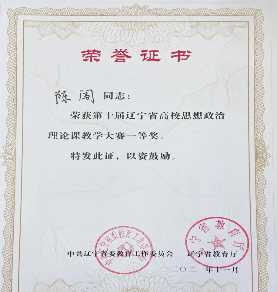 10月29日至11月1日,由中共辽宁省委教育工委、辽宁省教育厅主办的第十届辽宁省高校思想政治理论课教学大赛在沈阳举行,旨在进一步聚焦教学改革工作,培养一批具有较强创新能力和较高授课水平的青年骨干教师。学院的6名参赛选手经过近半年的精心准备和激烈角逐,在省级复赛和决赛中脱颖而出,取得了较好成绩:青年教师陈闯斩获本科课程-中国近现代史纲要一等奖,其余5位青年教师分别荣获研究生课程三等奖和本科课程三等奖。六间房 荣获本届大赛优秀组织奖。