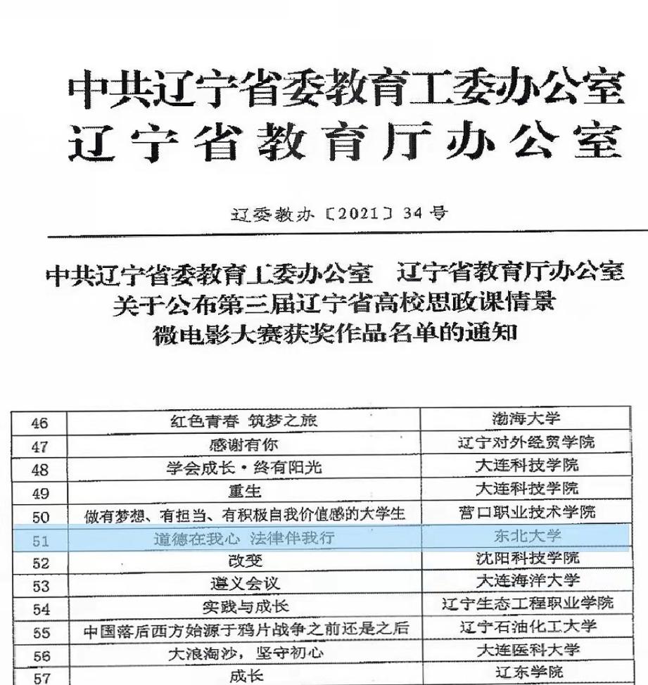 省委教育工委、省教育厅组织举办的第三届辽宁省高校思政课情景微电影大赛,鼓励大学生用微电影的方式展现学生心目中理想的思政课、呈现大学生学习思政课过程中的精彩故事,并希冀各高校师生以此次活动为契机继续深化思想政治理论课改革创新,切实增强大学生的学习成就感和获得感。田雪飞副教授指导的《道德在我心,法律伴我行》微作品荣获“第三届辽宁省高校思政课情景微电影大赛”二等奖。