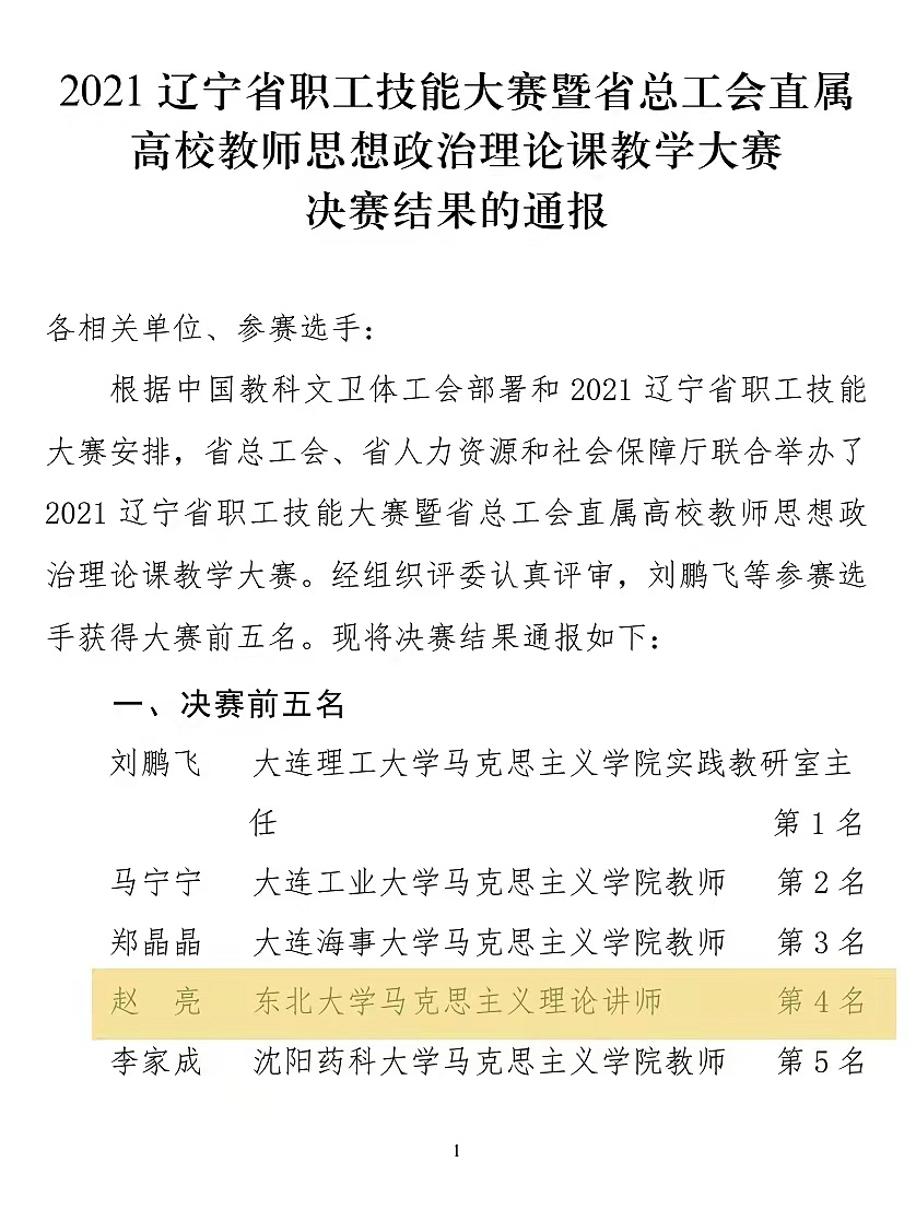 省总工会、省人力资源和社会保障厅联合举办的2021 辽宁省职工技能大赛暨省总工会直属高校教师思想政治理论课教学大赛,以全国教育大会、高校思想政治工作会议和学校思想政治理论课教师座谈会精神为指引,抓好教学基本功,锤炼基本素质,进一步把握思政课教学的目标导向、问题导向和结果导向,发扬和传承高校思政课教师的优秀教学传统,力求思政课教学达到“惊涛拍岸”的效果。学院青年教师赵亮在此次教学大赛中取得决赛第4名的佳绩。