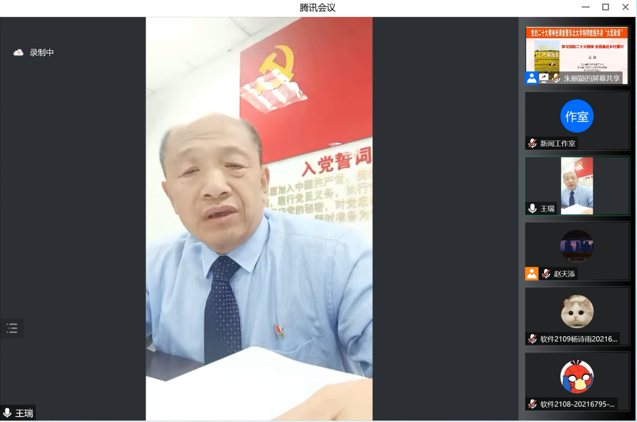 12月8日,六间房 特聘教授、原辽宁省财政厅驻陡岭村工作队队长兼村党支部第一书记王瑞应邀走进“大思政课”云端课堂,结合自身乡村振兴工作实际,为六间房 学生进行了题为《学习党的二十大精神 全面推进乡村振兴》的思政课教学。