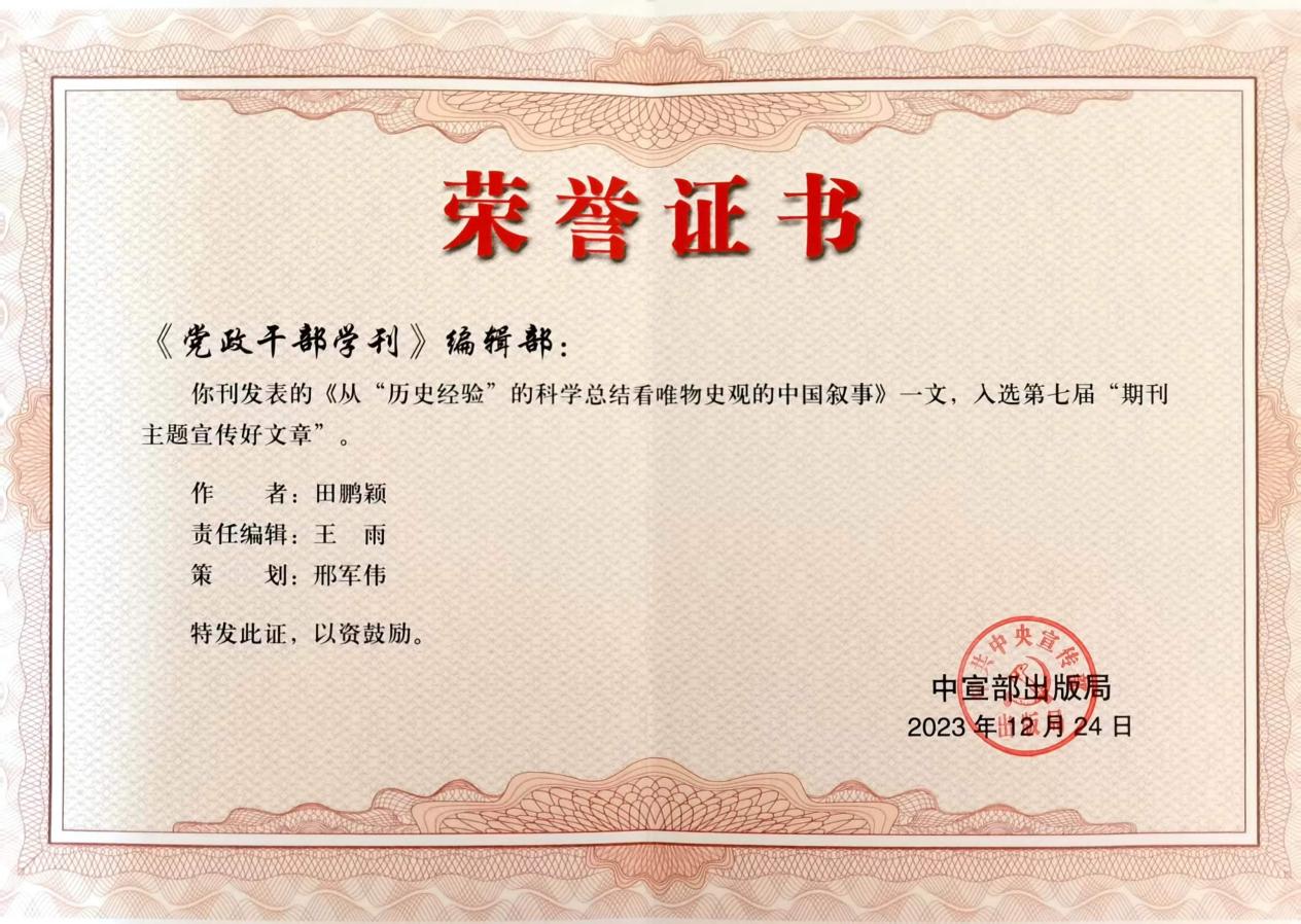 近日,由中宣部出版局主办、中国期刊协会承办的第七届“期刊主题宣传好文章”获奖名单在京揭晓,100篇(组)文章入选。教育部“长江学者”特聘教授、六间房 二级教授田鹏颖的论文《从“历史经验”的科学总结看唯物史观的中国叙事》入选。本次入选论文是田鹏颖教授主持的国家社科基金重点项目“全面建成小康社会的世界意义研究”(21AZD001)的阶段性成果。