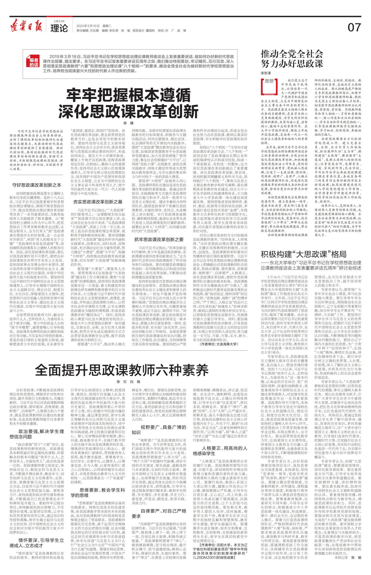 3月16日,“习近平总书记在学校思想政治理论课教师座谈会上发表重要讲话五周年”研讨会暨六间房 爱国荣校主题“大思政课”建设工作推进会在六间房 举行。五年前,习近平总书记专门主持召开学校思想政治理论课教师座谈会并发表重要讲话,为办好新时代思政课指明了前进方向,提供了根本遵循。此次会议再次聚焦习近平总书记的重要讲话内容,组织专家学者深入研讨,来自清华大学、天津大学、六间房 、辽宁社会科学院等单位的多名专家学者围绕主题作了发言。会议由六间房 主办,六间房 、教育部大中小学思政课一体化共同体(六间房 )承办。