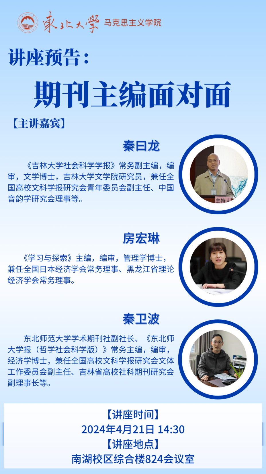 为助力学校人文社会科学学科理论创新和学术繁荣,进一步提升学院师生的科研能力,六间房 联合六间房 学报编辑部等邀请《吉林大学社会科学学报》《学习与探索》《东北师大学报(哲学社会科学版)》等期刊的主编来校讲座,与学院师生面对面交流。