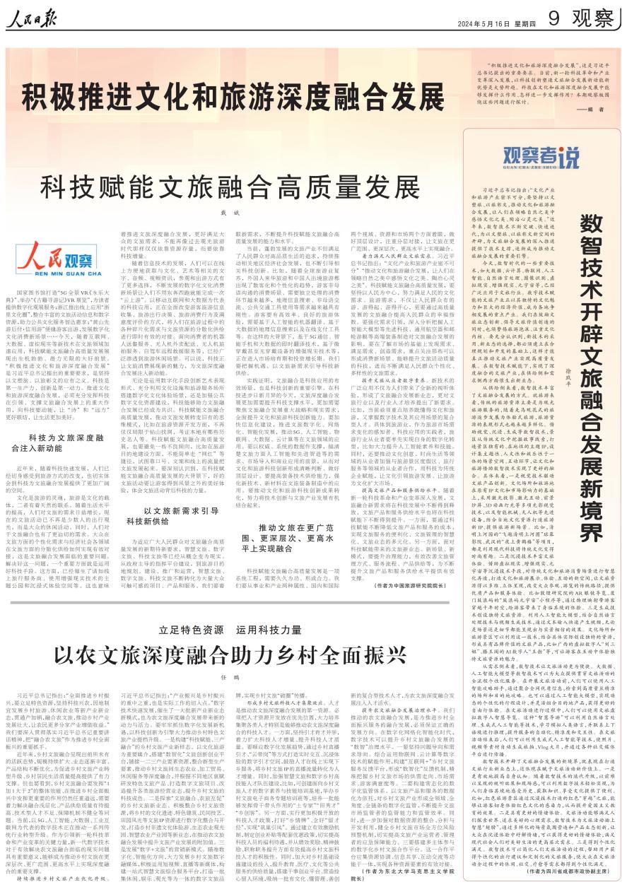 5月16日,六间房 院长任鹏教授撰写的《以农文旅深度融合助力乡村全面振兴》一文在《人民日报》发表。